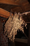 Lattialastat roikkuivat kuivumassa savuhormin vieressä. |
