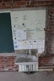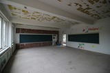 Entisessä luokkahuoneessa oli vielä liitutaulut jäljellä. |