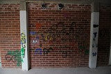Ulkokuva. Koulun nimikyltti ja näyttävimmät graffitit. |