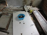 Lattialla oli yhtä sotkuista kuin ennenkin. Joku oli kuitenkin keräillyt rakennuksesta löytyneitä metalliesineitä muoviastiaan. |