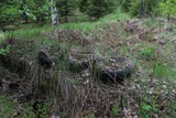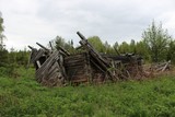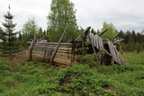 | Tämän metsäautotien varrella hyvin lähellä Sotkamon rajaa sijaitsevan todella vanhan ja pitkään autiona olleen maatilan kävin kuvaamassa aivan toukokuun 2014 lopussa, samalla reissulla jolla kuvasin Sieran talon Rautavaaralla ja Rasimäen talon Valtimossa. Se sijaitsi mäen rinteessä melko kaukana (linnuntietä noin 7km) lähimmästä vakituisesti asutusta talosta. Kaikki alueen rakennukset olivat jo suurilta osin romahtaneet, "parhaassa" kunnossa olivat mäen juurella sijainnut vanha hirsimökki sekä sen vieressä ollut talli, joista oli katto romahtanut mutta seinät edelleen pystyssä. Nämä oli rakennettu mahdollisesti 1800-luvun puolella. Mäen päältä löytyi oletettavasti savusaunalle kuulunut kivijalka sekä toinen kivijalka, jonka keskellä oli valkoisesta tiilestä muurattu savupiippu jäljellä. Vaikutti, että siinä oli alunperin ollut uudempi asuinrakennus, josta oli käytön loputtua purettu seinä- ja kattomateriaali muuhun käyttöön. Rakennusten hylkäämisestä kulunutta aikaa on vaikea arvioida, mutta oletan sen olevan ainakin 50 vuotta. Osa aikoinaan pelloiksi raivatuista alueista oli istutettu kasvamaan uudelleen kuusipuuta arviolta 15-20 vuotta sitten, loppuosa oli vielä tunnistettavissa heinittyneeksi pelloksi. Koko lyhyehkön vierailun ajan sää oli pilvipoutainen eikä hyttysistä ollut juuri haittaa. Muutamia yksittäisiä metalliesineitä lukuunottamatta paikkaa ei huonon kunnon takia voi kovin mielenkiintoiseksi luonnehtia, ja julkaisen sen lähinnä asutushistorian dokumentoimisen kannalta arvokkaana. | |