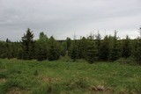 Tämä osa entistä peltoa oli vähitellen muuttumassa takaisin metsäksi suoriin riveihin istutettujen kuusten kasvaessa. Etualalla näkyy mäen päälle johtaneen kärrypolun pohja. |