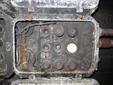 Osa mustuneista sulakkeista oli edelleen paikallaan, yksi tosin erottuu ympäristöstään koska on maalattu valkoiseksi. |
