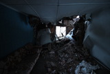 Savupiipun juuresta sisälle asti vähitellen valunut vesi oli saanut puurakenteet lahoamaan. Lopputuloksena oli kuvassa näkyvä laaja sortuma. |