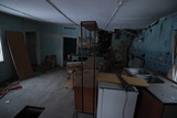 Huoneen keskellä alunperin roikkunut kattolamppu oli jossain vaiheessa poistettu, mutta tiskipöydän pyöreä lamppu oli saanut jäädä paikalleen. |