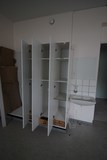 Tämä huone oli todella kapea mutta on säilytyskaapeista ja tuoleista päätellen kuitenkin toiminut potilashuoneena. |