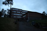 Rakennukset parkkipaikalta päin nähtynä. Huomaa yksi edelleen toiminnassa ollut katulamppu pihassa. |