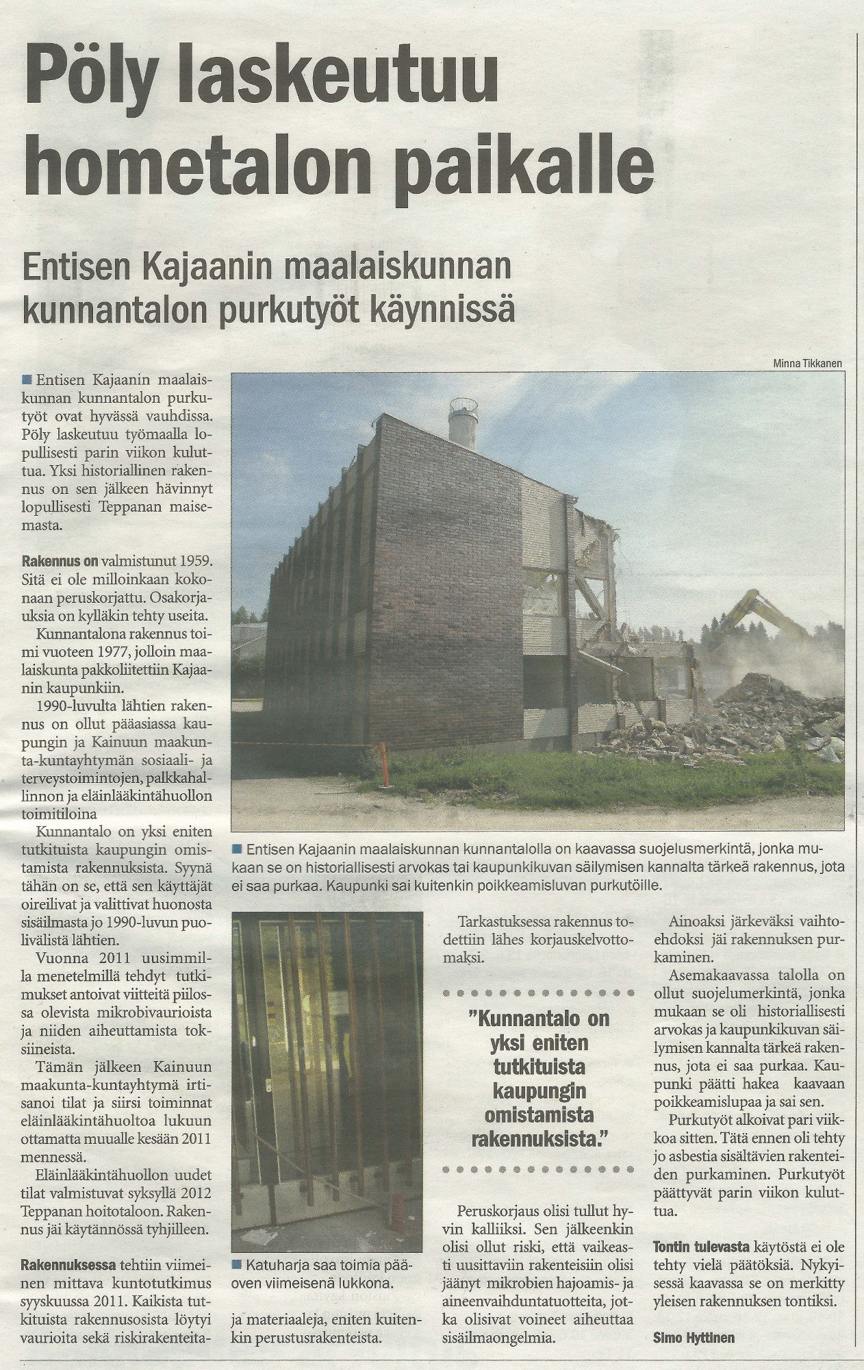 | Koti-Kajaani 29.6.2013: Pöly laskeutuu hometalon paikalle (skannattu lehtileike) |