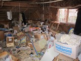 Ullakon suuremmassa huoneessa lojui kasoittain sanomalehtiä ja pahvilaatikoita. |