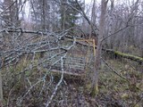 | Lokakuun 2012 loppupuolella lähdin Kajaanin Pärsänsuolle pyöräilemään saatuani sähköpostiin vinkin tien varressa sijaitsevasta autiosta rintamamiestalosta. Kolean syyspäivän pyöräretki tuottikin pian tulosta, kun yhdeltä asuttujen talojen väliseltä tontilta paljastui ilmiselvästi rappiotilassa ollut punainen mökki. Jätin polkupyörän tienvarteen ohi kävelleen vanhan miehen epäilevästä vilkaisusta huolimatta ja etenin lähemmäs kohti taloa. Takapihalle päästyäni huomasin ilokseni, että ovi oli auki. Sisätilat olivat pysyneet yllättävän siistissä kunnossa ja tavaroita oli jäljellä paljon sekä alakerrassa että ullakolla. Löysin sanomalehtiä 1990-luvun alusta, mutta epäilen talon yleiskunnon perusteella, että se on autioitunut vasta joskus vuosituhannen vaihteen tienoilla. Pihapiirissä oli pystyssä myös sauna ja ulkorakennus, mutta ne eivät olleet mitenkään erikoisia. | |