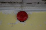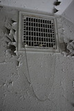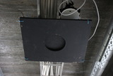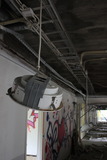 Käytävän kattopanelointi oli purettu, mutta vanha keskusradion kaiutin oli jäänyt taustalevyineen jäljelle. |