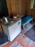 Pukuhuoneen tiloja. Vasemmassa laidassa näkyvä valkoinen, metallinen laatikko on oletettavasti ollut jonkinlainen lämmitin (tai sitten vanha pyykkikone). |