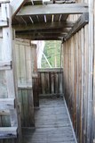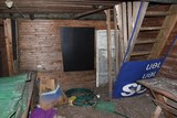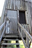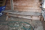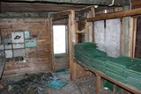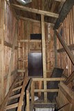 Yläkerran puurakenteita, alhaalla raskas luukku joka piti pönkittää auki laudanpätkän avulla jotta se ei pamahtaisi takaisin kiinni kuvausten aikana. |