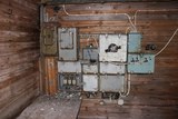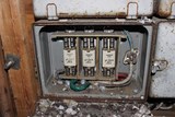 Kytkinlaatikko, josta on aikoinaan säädelty ylä- ja alamäen valoja. Etualalla seinästä irronnut johto. |