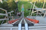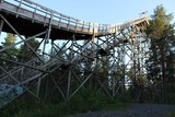 Suurimman hyppyrimäen sivuprofiilia. Huomionarvoista on, että koko hyppyrimäki on tehty puusta, toisin kuin esimerkiksi Hämeenlinnassa. |