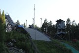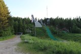 Suurin hyppyrimäki ja tuomaritorni edellisen kuvan rakennuksen edustalta nähtynä. Taustalla Vimpelin radio- ja tv-masto. |