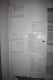 Ilmoitustaulu ja hyllyjä keittiön toisella seinustalla. |