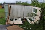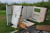Kuistin seinät irrallaan nurmikolla. |