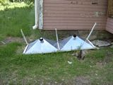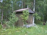 Ulkorakennus, sen takana näkyy puupino joka oli ilmestynyt edellisen vierailun jälkeen. |