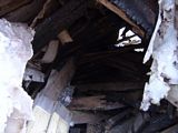 Näkymä raunioiden sisään. Laudoissa on jälkiä tulipalosta. |